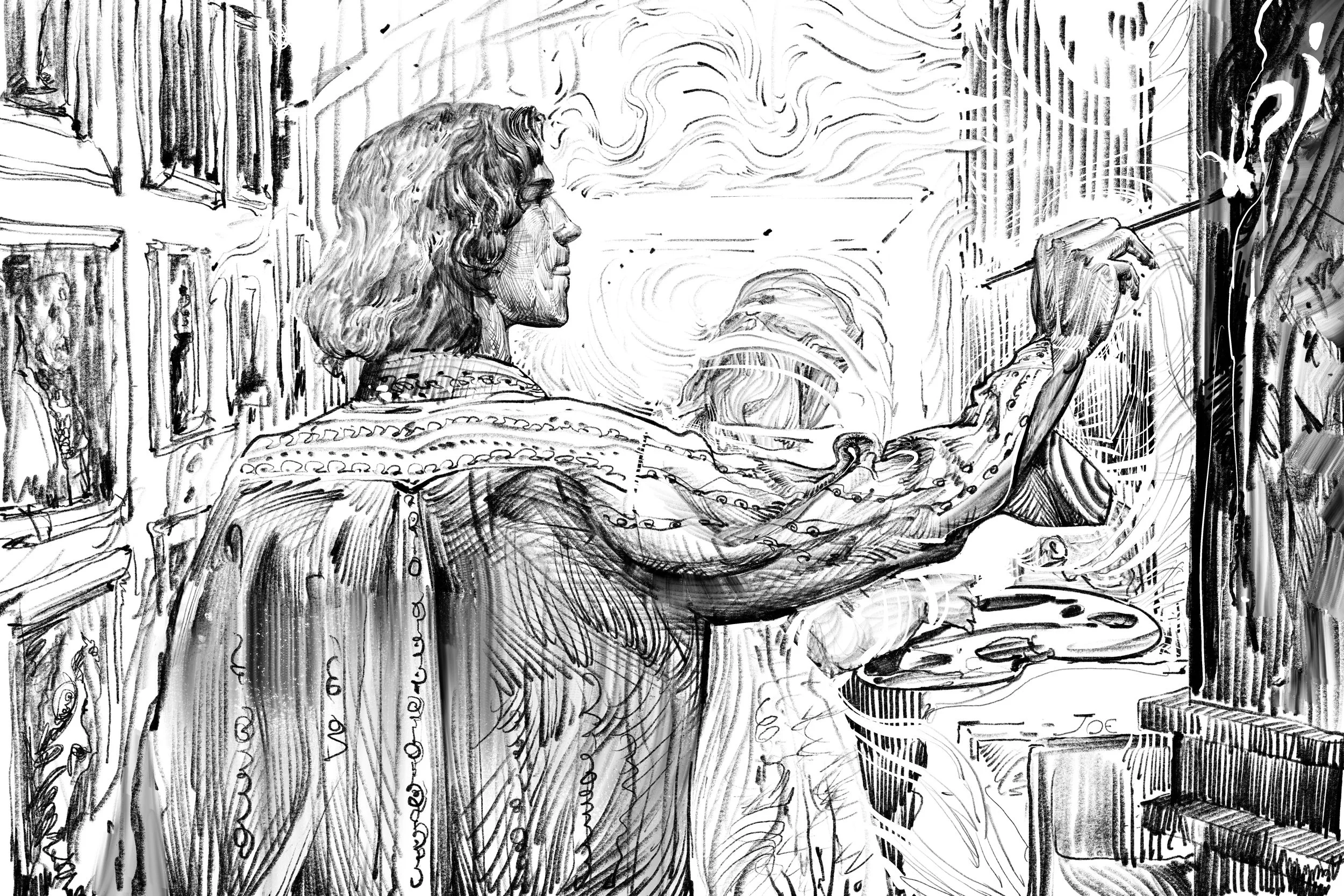 I used photographs as references and did the drawings on an iPad. It all started with me wanting something to hang in my bedroom, then quickly mutated into multiple drawings because I enjoy spontaneous abstraction. It’s tricky to judge a sketch for its completion, especially when it’s blending in with deliberate abstractions. I tried not to overwork my drawings. To me, a drawing without flaw is a life without vitality. When the drawings presented themselves as both broken and whole, I knew my work was done.
