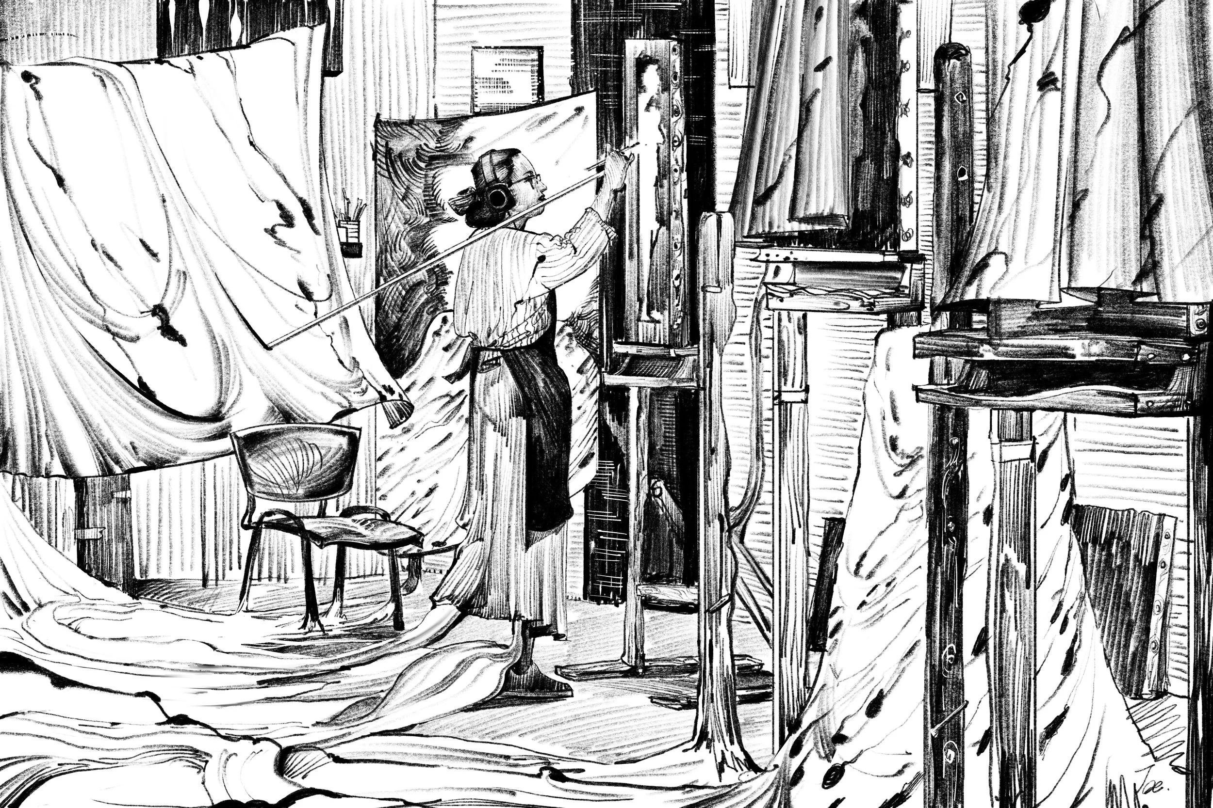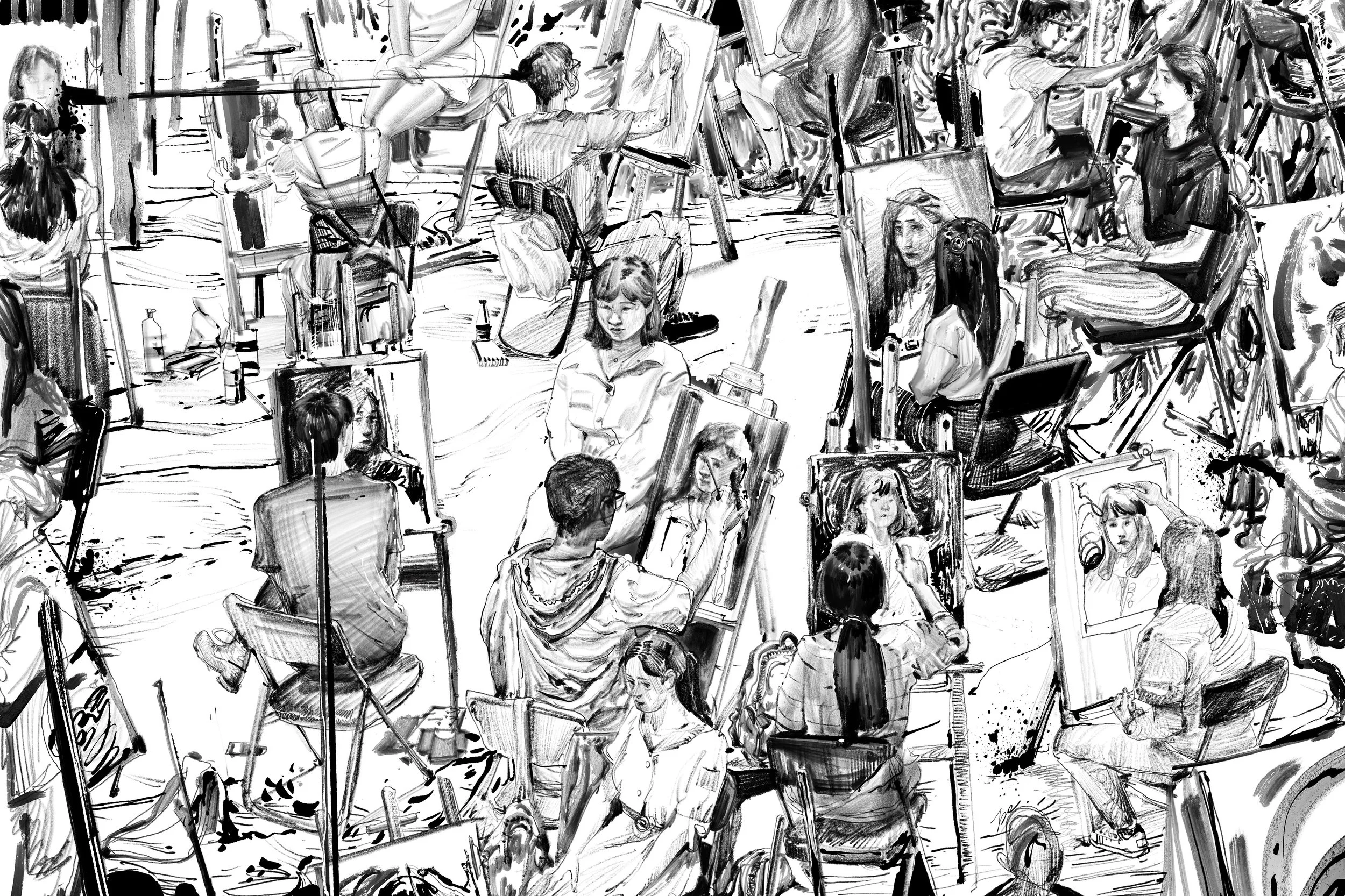 Art students, what can I say? The lost ones, the regretted ones, the fake ones, and the obsessed ones. In this series, I intended to convey the conflict of being in the studio, struggling to manifest oneself on the paper, and yet, hungering for approval from teachers, hoping the next attempt would be both true to oneself and also prestigious.